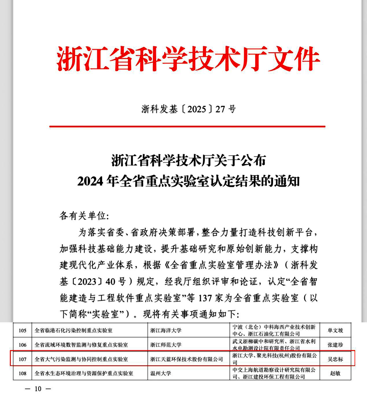 2025年6月4日,浙江省科技廳發(fā)布《浙江省科學技術廳關于公布2024 年全省重點實驗室認定結果的通知(浙科發(fā)基〔2025〕27號)》,由浙江天藍環(huán)保技術股份有限公司牽頭,浙江大學和聚光科技(杭州)股份有限公司共建的“全省大氣污染監(jiān)測與協同控制重點實驗室”獲批組建,成為全省環(huán)境領域唯一以企業牽頭建設的省級重點實驗室